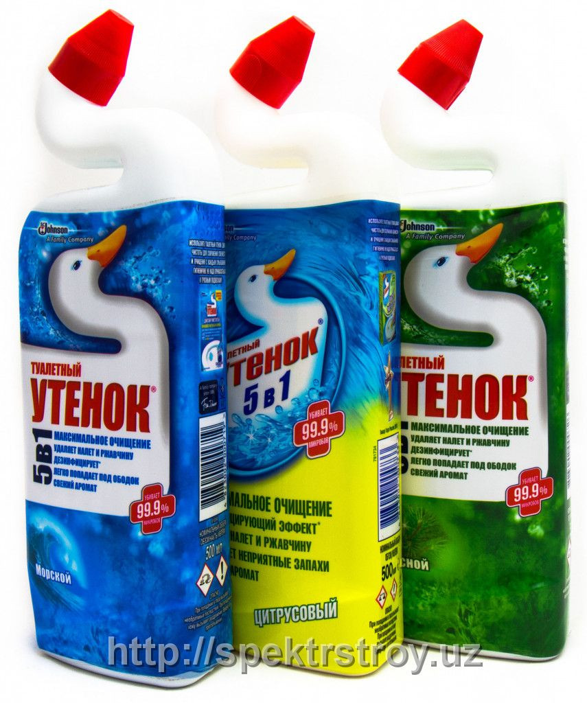 Чистящее средство для дома Утенок объемом 900мл. Благодаря уникальной форме горлышка "Туалетный утенок" объемом 500мл лучше проникает в труднодоступные места скопления бактерий под ободком унитаза. Убивает 99,9% микробов.
