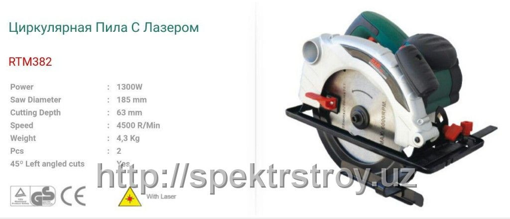 Циркулярная пила с лазером RTM382, 1300W, 4500об/мин,4,3кг
